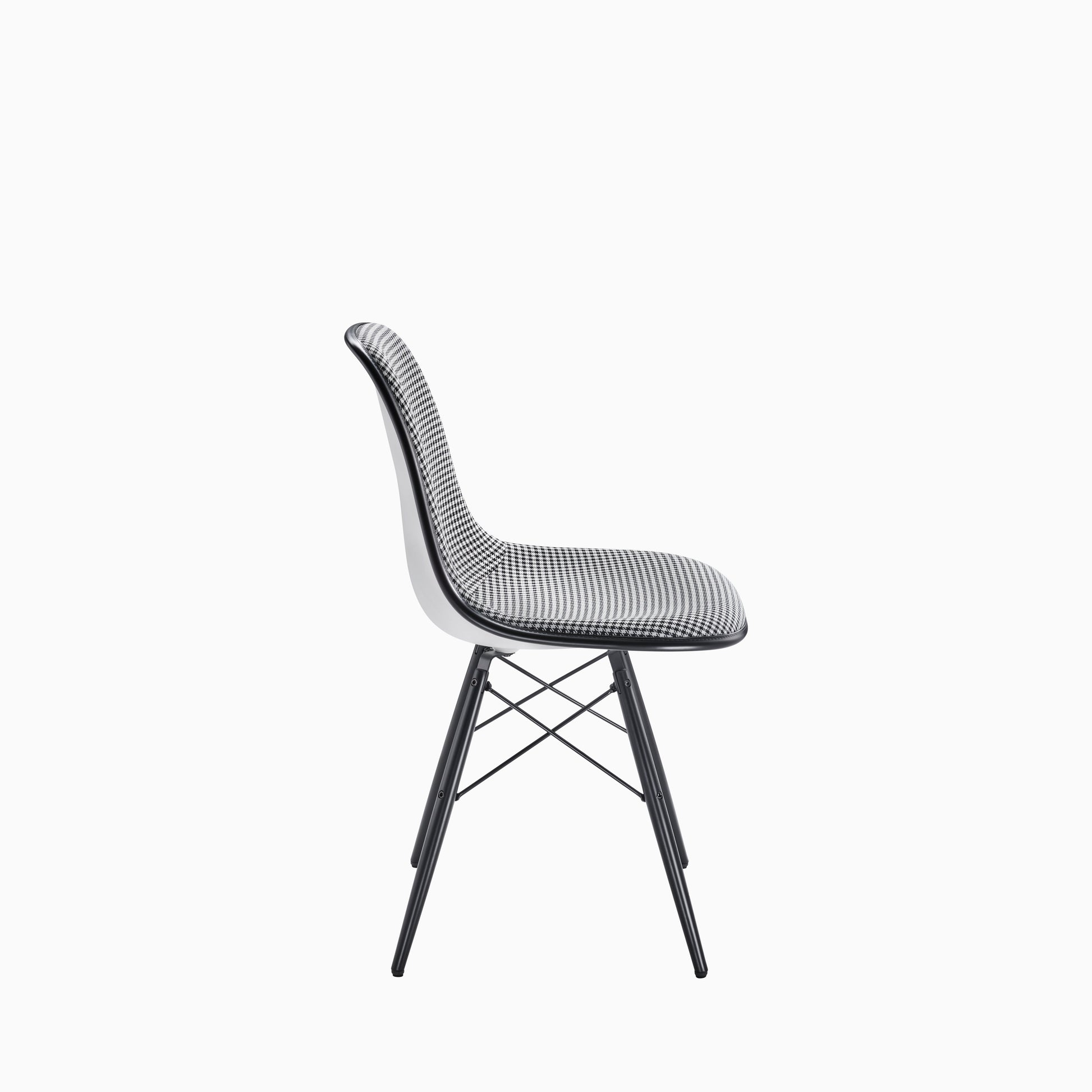 Product story: Iconic look, exclusive design: the Eames Plastic Side Chair Pepita Edition by Vitra for Porsche combines functionality and design with precise craftsmanship of high-quality materials. Tailored to the contours of the human body, the shape of the seat shell ensures comfortable support, whether at the dining table or in the home office. The full upholstery with original Porsche Pepita fabric on the seat and back blends into the White shell as an elegant design contrast. The Black maple base and welted edge in basic dark round off the elegant look of the shell chair. Gliders on the foot base also ensure effortless movement on hard floors. Made in Germany. Limited to 1963 units.